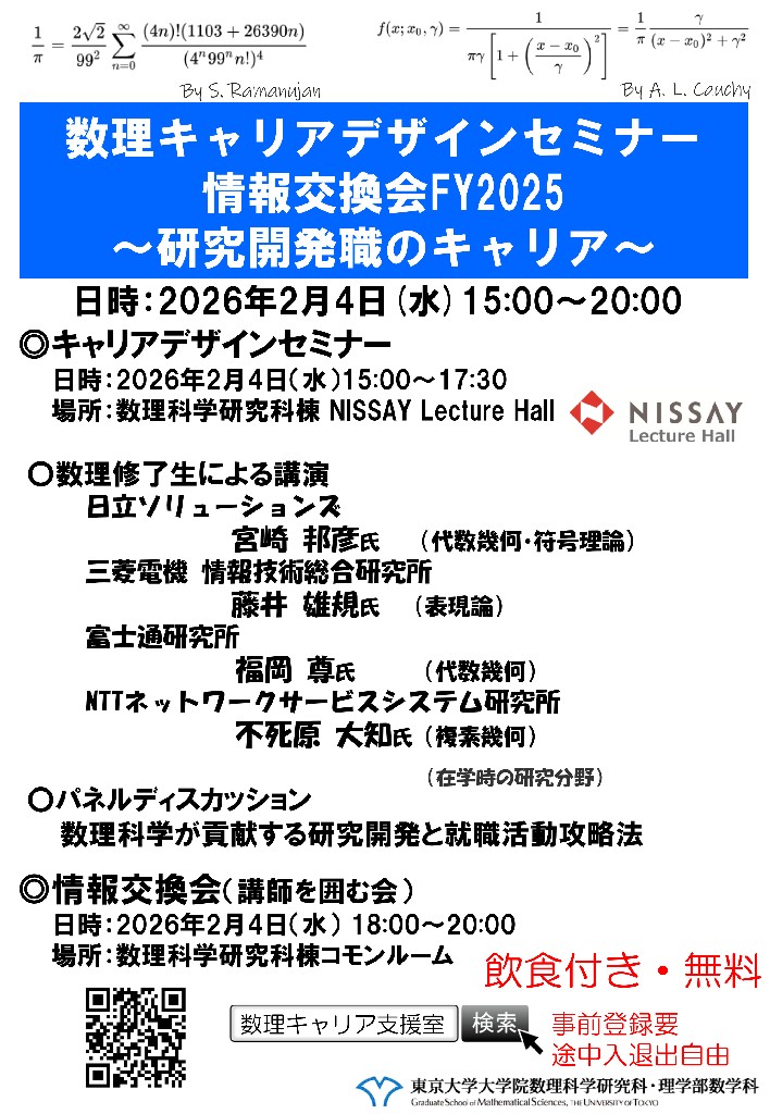 東京大学大学院数理科学研究科では、東大数学同窓会の後援により、下記の要領にて「数理キャリアデザインセミナー・情報交換会FY2025:研究開発職のキャリア」を開催します。